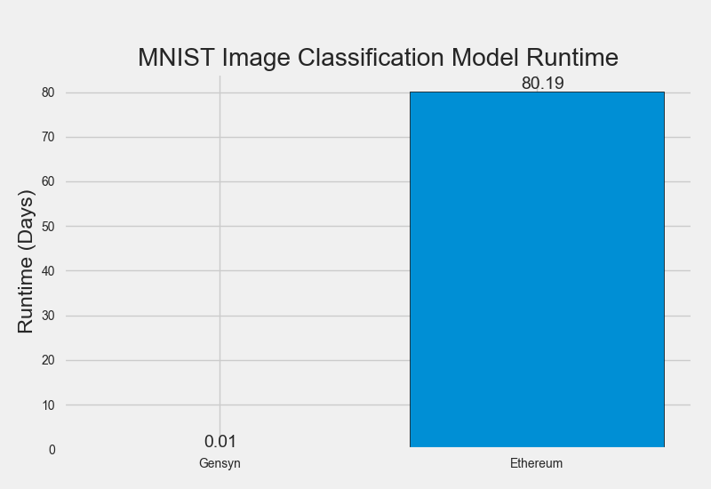 Ethereum, however, achieves trustless consensus only via extremely expensive on-chain replication of work. This is completely unsuitable for deep learning. Training a small MNIST neural network (~400M processor operations) takes ~8 minutes on an average laptop but would take ~80 days on Ethereum at a cost of approximately $32m. To address this, Truebit showed that it's possible to perform simple computational work off-chain (and thus with less overhead) and prove to the chain that it was performed correctly. They achieved this by modelling participants as financially-rational actors and carefully constructing incentive structures. Specifically, they solved the verifier's dilemma by intermittently requiring workers to produce incorrect work and awarding verifiers with a jackpot if they spot it.
