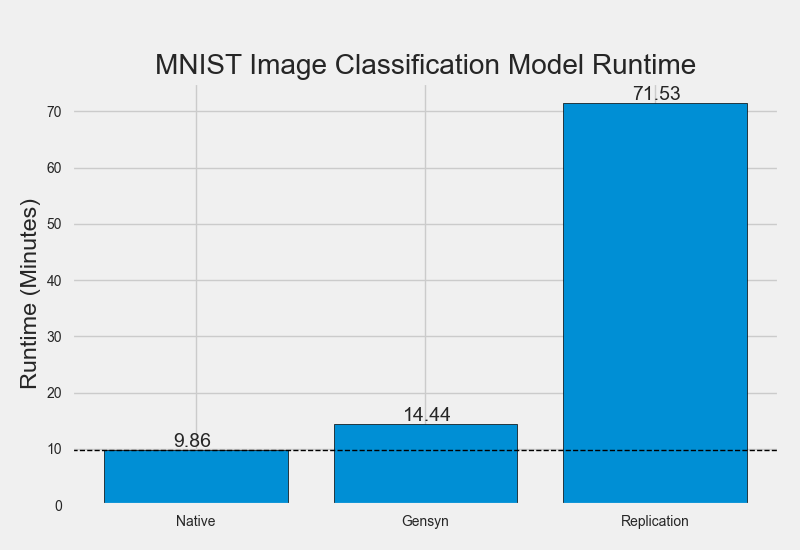 We evaluate our solution through Python simulations in order to assess the magnitude of performance gains delivered by the Gensyn protocol. In this instance, we gauge performance as the aggregate time in seconds taken to complete a 100 epoch training job on a small MNIST image classification model. We test this on a 6-Core Intel Core i7 processor.